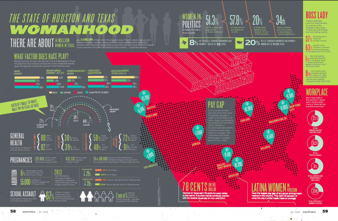 There are about 14 million women in Texas, and 3.4 million of them live in the Houston area. They’re a diverse group comprised of workers, mothers, wives, partners, voters, leaders and everything in between. But, they don’t always have it easy. Here we take a look at what it means to be a woman in Houston and Texas by the numbers.
